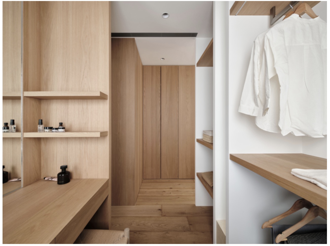 "Seeing Between Light and Shadow" is located in a prime location with convenient living. The inward-sliding walkways around the building create moments of respite, maintaining privacy while creating a tranquil atmosphere amidst the hustle and bustle of life. However, while this inward-sliding structure offers the homeowners a great sense of privacy, it hinders the flow of natural light into the home. To improve this, the designer used a pure, warm color palette, creating a simple and elegant yet warm atmosphere, and framing a bright and open view.