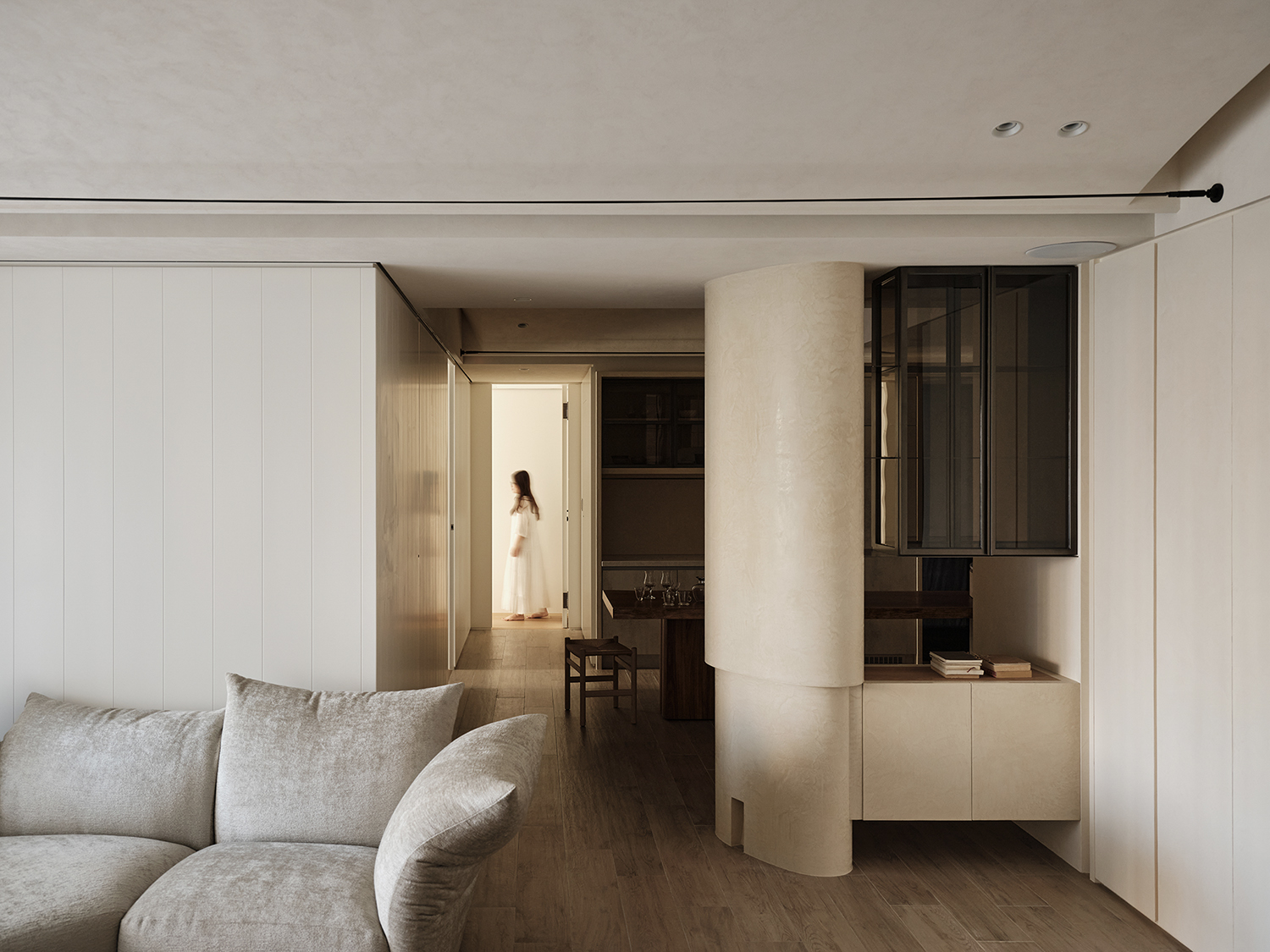 "Trying to redesign the existing layout was a perfect opportunity to challenge the demolition of existing structures." To create a three-bedroom, two-living room apartment suitable for a retired couple and their two adult children, Hsin-hui, like a sculptor, sculpted the curved structures, interspersed with ceilings and corners, creating a free-flowing flow.