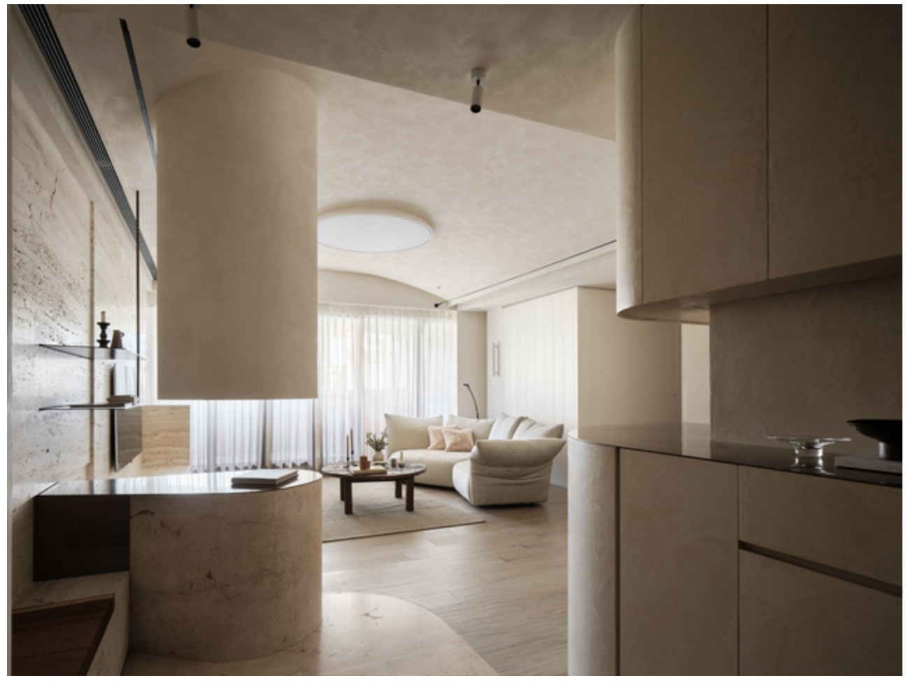 The dining room, clad in a beige mineral paint, is complemented by a pink stone center island, extending elements from the entryway inward, creating a sense of spatial continuity. The curved ceiling elevates the view, while decorative linear lighting casts a variety of light and shadow, adding interest to the details. Metal cabinetry sits above the kitchen, harmoniously complementing the natural travertine. Shelving on either side creates a soft, light, and airy atmosphere.